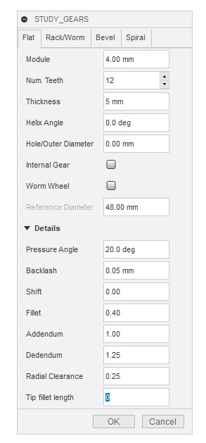 実は現状では歯先の延長のユーザインタフェースは使いにくくなっていて、 ここで入れた値は歯先の延長部分に付けるフィレットの最大半径なのですが、 必ずしもこの半径分だけ歯先が延長するわけではなく、これはあくまで目標値にすぎません。