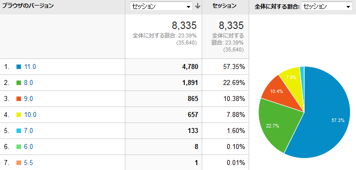 実はこのサイトは IE8 で見るとかなり見難いので、申し訳ない限りです。 一応、平均ページ滞在時間を見ると、他のバージョンの訪問者に比べて明らかに短いわけではないので、 何とか読めているということだと理解しています。