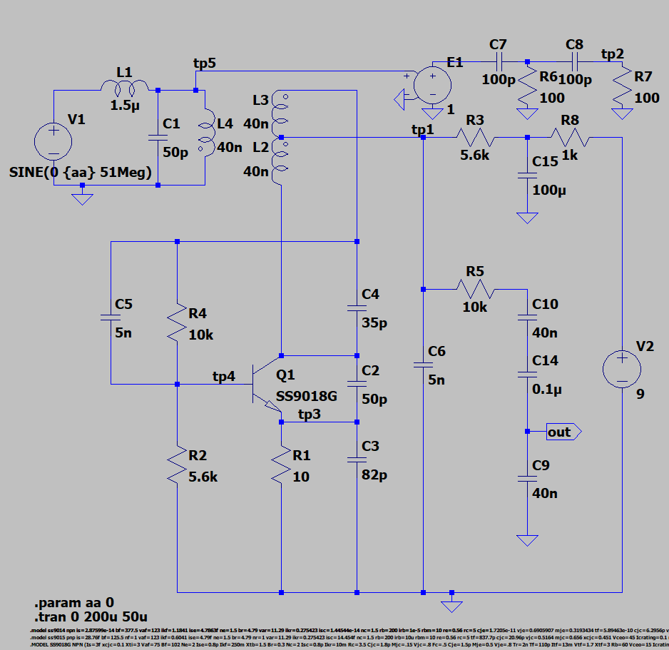 発振回路の詳細としては、 Q1 のコレクタに流れる電流値を L2、L3 経由で Q1 のゲートに ポジティブフィードバックしているのだと思うけれど、 発振周波数がどこで決まっているのかなど、まだよく理解できていない。