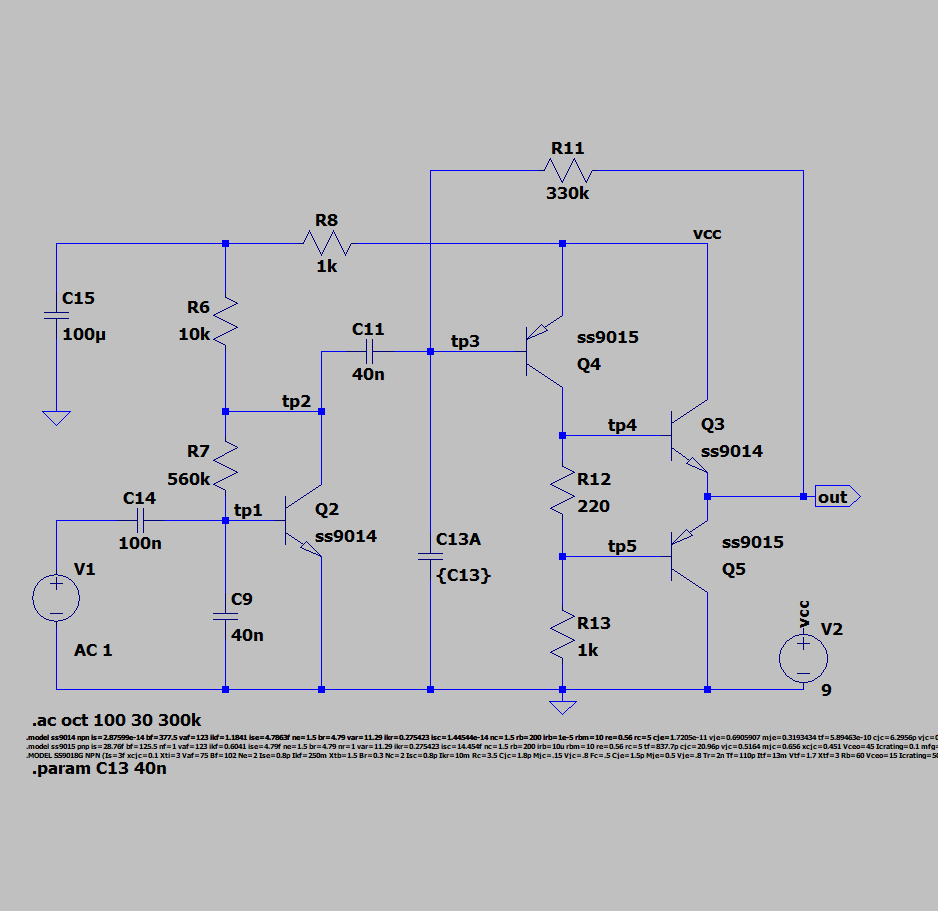 - 出力から R11 で負帰還がかかっているが、40nF と 330kΩ だとカットオフが 12Hz くらいになるので、これは DC レベルを決めるための負帰還で、AC 的には帰還はないと思って良さそう