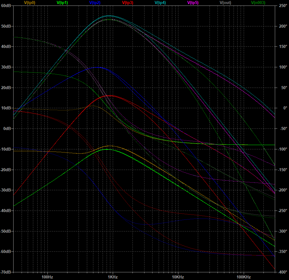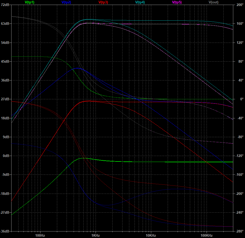 結果的に、400Hz - 5kHz くらいの中音域に帯域を持つ 60dB オーバーの低周波増幅器となっている。