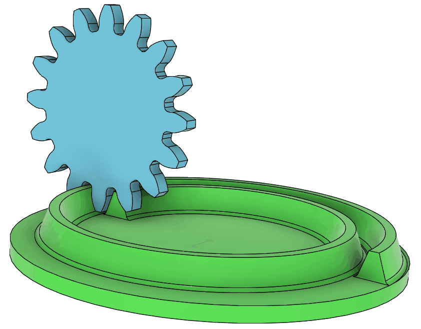 小径歯車では相手の歯先が歯元部分に食い込むのを避けるため、歯元部分にトロコイド曲線が現れるのですが、SpurGear はこれを生成しないため、小径歯車と大径歯車の組み合わせでは引っ掛かりが生じて正しく回転させられません。(平面図で見ると歯底円の直径にも違いがあることが分かります。Spur Gear では準拠する規格が違うためだそうです)