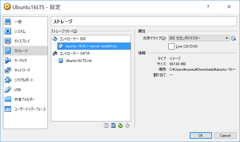 VM の右クリックから [設定]-[ストレージ] で光学ドライブに 上でダウンロードした C:\Users\osamu\Downloads\ubuntu-16.04.1-server-amd64.iso を割り当て、起動します。
