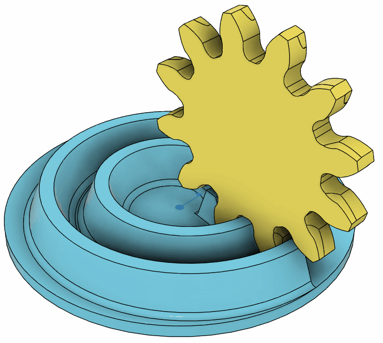 サイズを小さくすると普通の平歯車では角が当たってしまうため、単なる平歯車を使おうとすると少々トリミングしてやる必要が生じるみたいだった。(下図はトリミングしたもの)