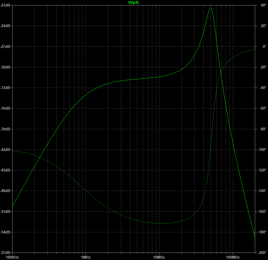 アンテナ入力から tp4 への AC 伝達特性をグラフにすると、 50MHz で緩やかなピークを取ることを確認できる。