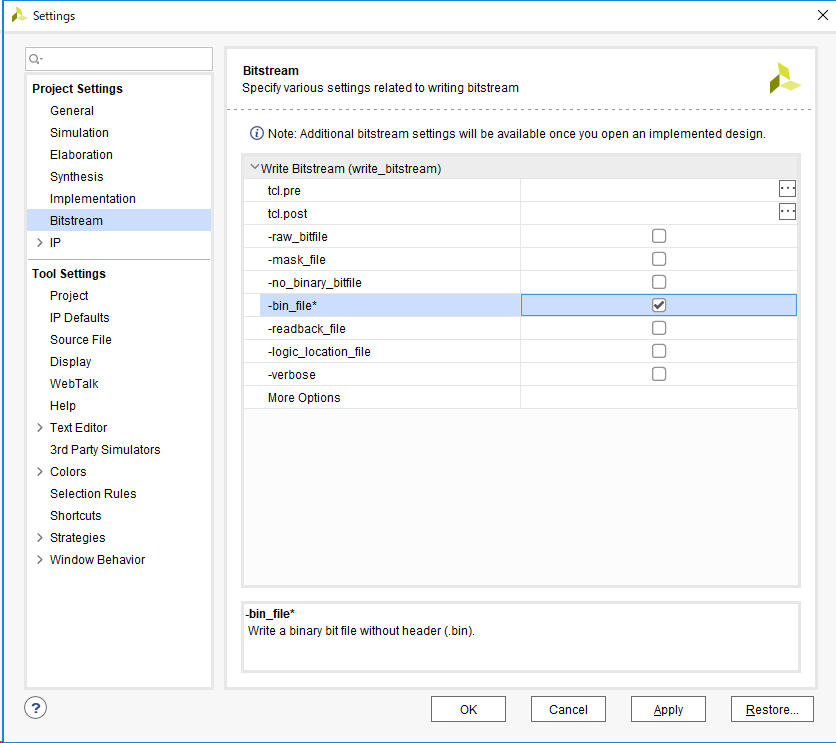 vivado の [Flow Navigator] の [Generate Bitstream] の上で右クリックして、 [Bitstream Setting...] を選ぶと、bit ファイルと同時に bin ファイルも生成してくれるようになる。