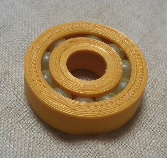 内径 10、外径 30、ネジ M14x1 を積層 0.1 mm で印刷したところ、そこそこ使い物になりそうなものができた。本物のベアリングのように空回しでいつまでも回り続けるほどではないけれど、かなりの荷重があっても多少のトルクで回るという意味では満足いく性能だと思う。