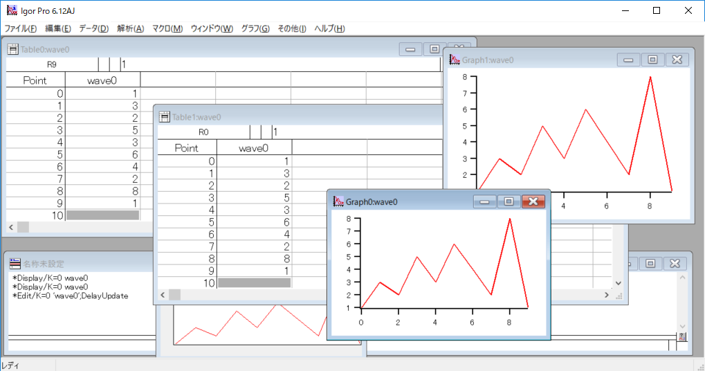 実はこの「ログ」はそのまま Igor のコマンドになっていて、 同じ文字列をコマンドウィンドウに打ち込むことで、 以前に行った操作を再度実行することができます。
