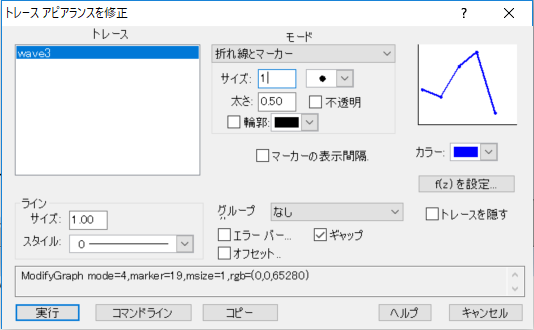 - グラフ上で赤線部分をダブルクリックし、[カラー] で "青" を選択、[モード] を "折れ線とマーカー" にして、[サイズ] を "1"、形状を "●" にする。