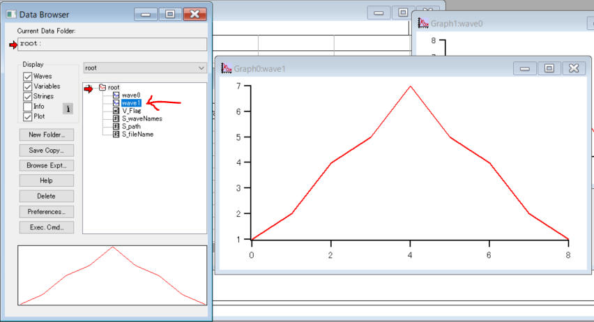 Data Browser に wave1 が表示され、プロットをダブルクリックすることでグラフを表示できました。