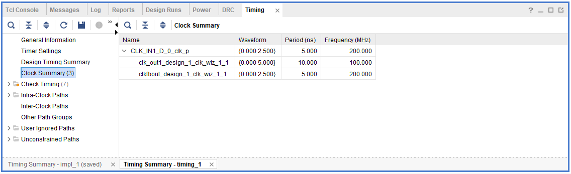 Setup, Hold, Pulse Width とも Slack (余裕) の値は正になっていて、タイミング制約を満たしていることを確認できる。そして Clock Summary で各クロックに正しくタイミング制約がかかっていることを確認できる。