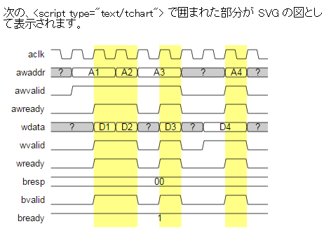 このサービスで作成した svg を手で切り貼りして html に埋め込む代わりに、 html 中に以下のように直接タイミング図定義を書いておいて、 javascript で svg に変換して表示した方が、 あとから修正することなどを考えると便利です。