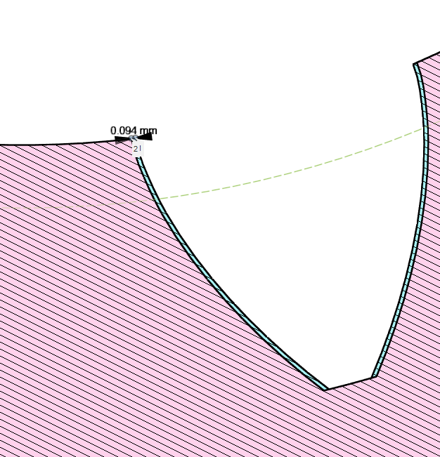 例えば上で作成した歯数12の内歯車と歯数6の外歯車の組み合わせをバックラッシュ 0 で作成して組み合わせてみた下図からは、この組み合わせでインボリュート干渉が起きないことを確認できます。これは歯数6の歯車に切り下げが発生している(歯元のトロコイド曲線が基礎円より上まで来ておりインボリュート領域が本来の長さまで到達していない)ためであり、切り下げを行わなければ小歯車のインボリュート曲線と内歯車の歯先が干渉します。判別式は小歯車の切り下げを考慮していないためにこの「仮想的な干渉」を検出してしまうのだと思います。