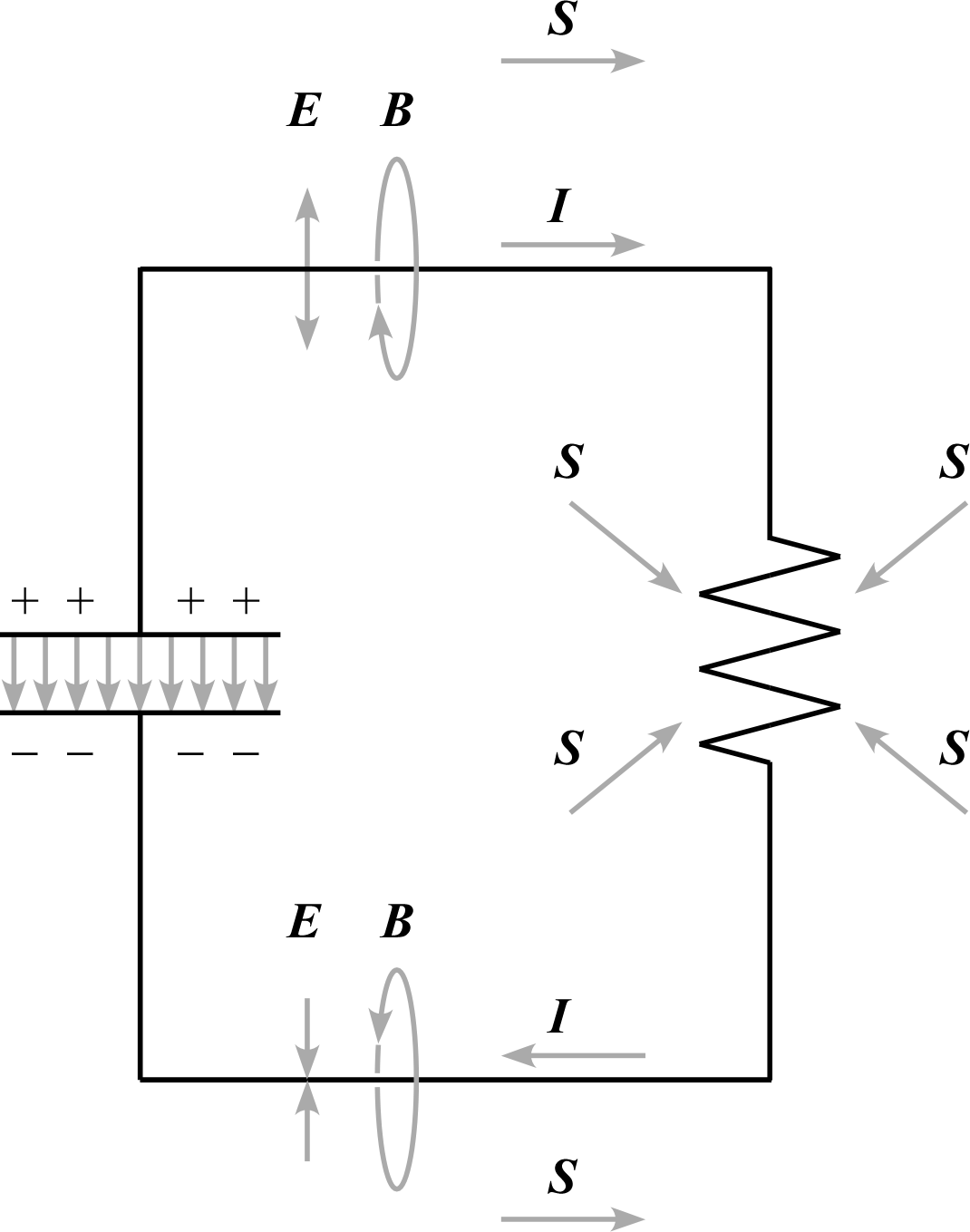 図の上部では導線は周囲に比べて高電位であり、電場は導線を中心に外向きである。 また、電流は右向きに流れるため、磁場は図の向きで導線を取り囲む。 その結果、ポインティングベクトル は右向きとなり、 コンデンサから抵抗へエネルギーを運ぶ。