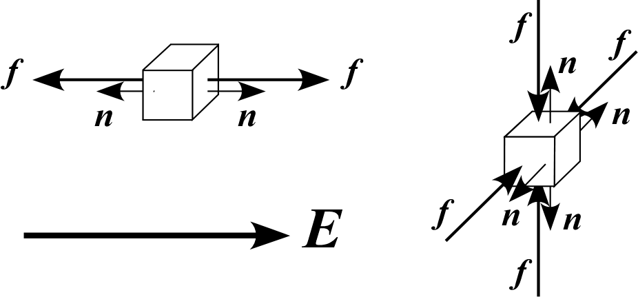 力は常に と同じ向きになるため、 微小領域における電場に垂直な界面には引っ張り(外向き)の応力がかかることになる。