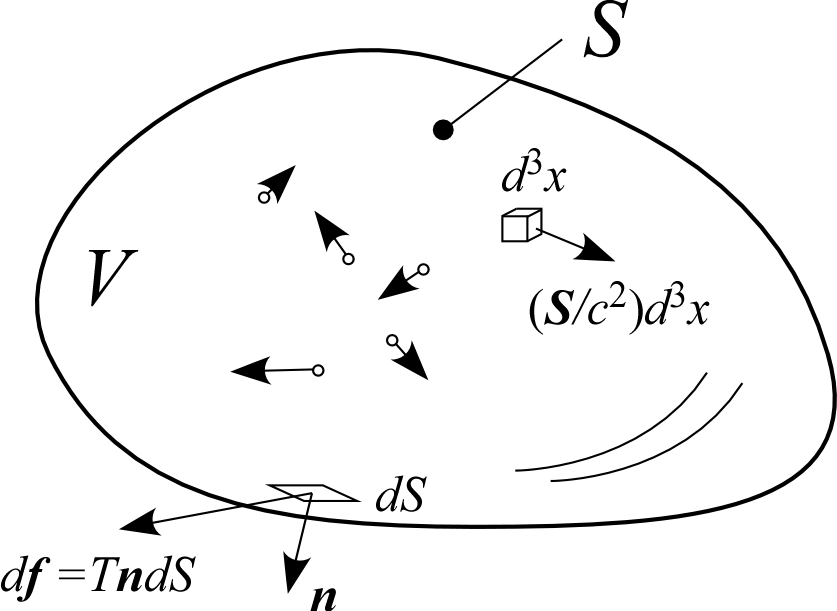 すべての質点(点電荷)を含む閉曲面 と、 に囲まれる体積 を考える。