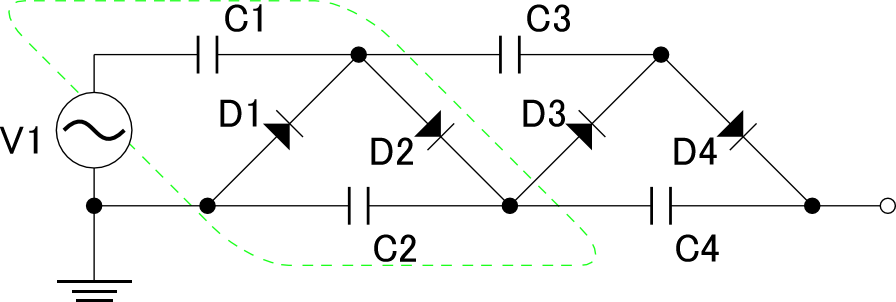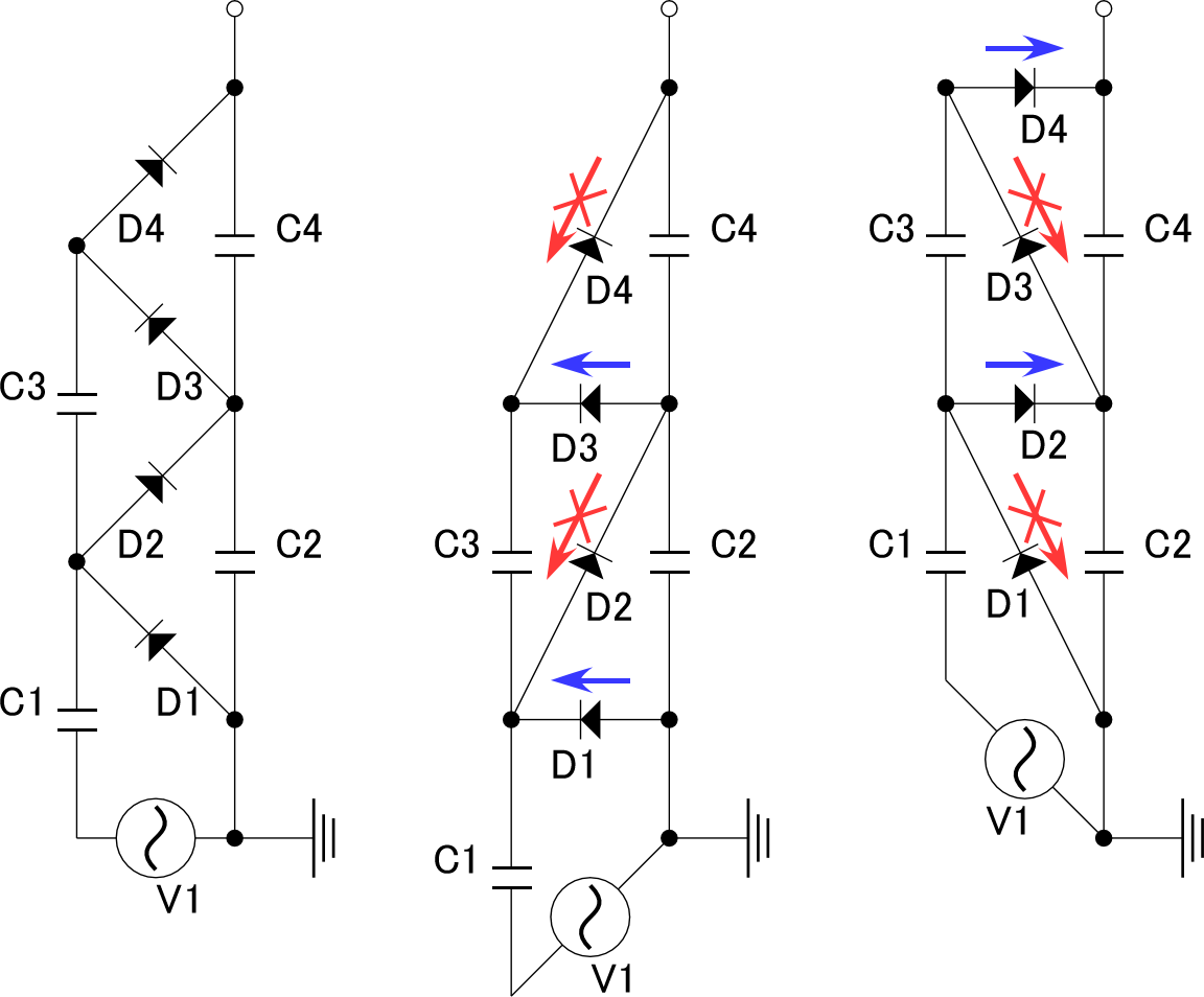 ダイオードやコンデンサには、1つあたり V1 のピーク・ツー・ピーク電圧までしか電圧が掛かりませんので、 数百V耐圧の部品を使って、数十kVというのような高電圧を作り出すことができるというのも理解できます。