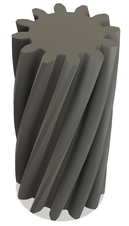 ということで、歯に直角にモジュール $m_n$ を持つはすば歯車を作るには軸に直角な断面上にモジュール $m_t=m_n/\cos\beta$ の歯車形状を作り、それを中心軸に対してねじれ角 $\beta$ の分だけひねりながら押し出せばよい。